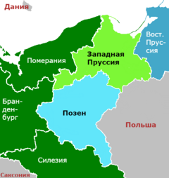 После Первой мировой войны отношения обострились. Поляки стали требовать передачи территории провинции в состав воссозданного польского государства. После Великопольского восстания 1918 года, согласно условиям Версальского договора, в январе 1920 года основная территория провинций Позен и Западная Пруссия была передана Польше. Лишь небольшая приграничная полоса, на которой преобладало немецкое население, осталась в пределах Германии. При этом к Польше под давлением Антанты отошёл и ряд районов с преобладанием немецкого населения (Бромберг, Лисса и т. д.).