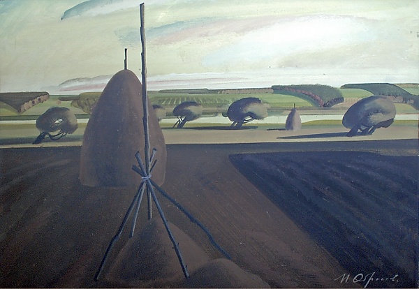 На картине изображён пейзаж с тёмной пашней, занимающей правую часть композиции, и стогом сена слева. За ними расположены редко стоящие в ряд деревья с округлыми кронами. В глубине видна светлая полоса реки, а далее до горизонта простираются зелёные поля с перелесками. Небо написано в светло-зелёных тонах с присутствием облаков, что придаёт работе особую атмосферу. Расположение элементов подчёркивает глубину и протяжённость композиции.