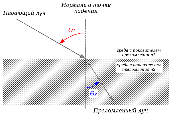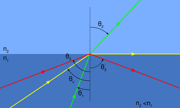 Если луч света переходит из среды с меньшим показателем преломления в среду с бо́льшим показателем преломления (например, из воздуха в воду), то угол между лучом и нормалью к границе раздела уменьшается после преломления. И наоборот, в случае перехода в менее оптически плотную среду угол увеличивается. Во втором случае угол преломления может превышать 90°, так что преломления не происходит вообще и весь свет отражается; это явление называется полным внутренним отражением[5].