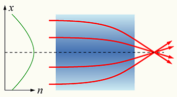 Свет, распространяющийся в неоднородной среде, проходит из одной точки в другую за минимальное время. Из этого принципа можно вывести закон преломления света на границе раздела между средами с разными показателями преломления, который называется законом Снеллиуса[12].