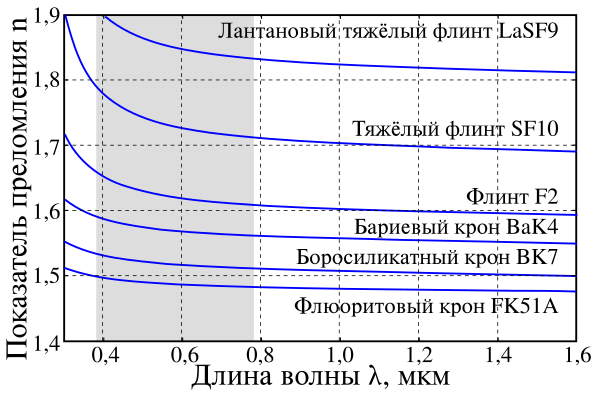 Для оценки дисперсии в оптическом диапазоне применяют среднюю дисперсию или главную дисперсию (), которая равна разнице показателей преломления на длинах волн красной (λC = 6563 Å) и синей линий водорода (λF = 4861 Å)[22]. Индексы F и C обозначают соответствующие фраунгоферовы линии[23].