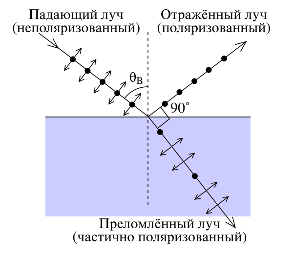 Интенсивности преломлённой и отражённой волн зависят от поляризации падающего света: s-поляризованный свет имеет более высокий коэффициент отражения, тогда как p-поляризованный лучше проникает в среду. Поэтому даже если на границу раздела сред падает неполяризованный свет, и преломлённый, и отражённый лучи становятся частично поляризованными (если угол падения не равен нулю). Если угол между отражённым и преломлённым лучами составляет 90°, отражённый свет становится полностью поляризованным. Угол падения, при котором это происходит, называется углом Брюстера. Его значение зависит от относительного показателя преломления сред[27]: