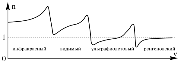 В широком диапазоне длин волн электромагнитного излучения зависимость показателя преломления от частоты является нелинейной и состоит из участков, где показатель преломления возрастает с частотой — этот случай называется нормальной дисперсией (поскольку такая ситуация типична), — и небольших участков, где показатель преломления стремительно падает, что называется аномальной дисперсией. Участки аномальной дисперсии обычно расположены вблизи линий поглощения вещества[26].