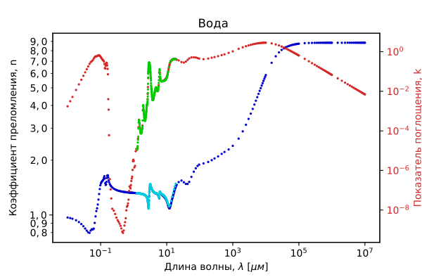 где описывает затухание, — длина волны и — мнимая часть показателя преломления[32].