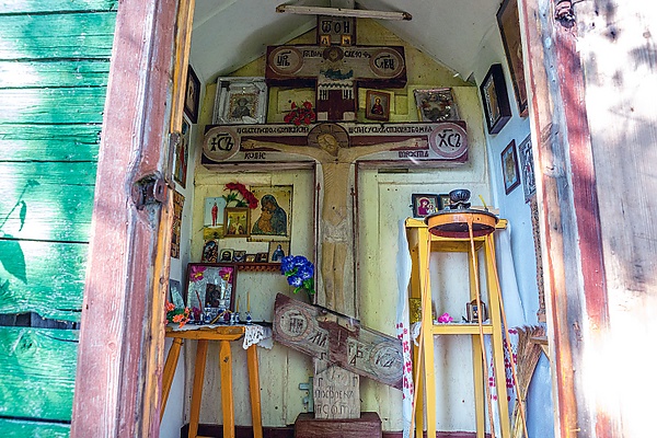 Реликварий креста представляет собой часовню-футляр с каркасно-обшивными стенами, практически квадратную в плане (1,94 × 2,09 м). Крыша часовни устроена в виде двускатной самцово-слеговой кровли, покрытой волнистой асбофанерой. Обшивка стен выполнена простым тёсом, углы оформлены лопатками. В западном фасаде часовни устроен вход. Фронтоны декорированы резными причелинами. Узор резьбы представляет собой два ряда сквозных круглых отверстий. Нижние края причелин по контуру порезаны в виде чередующихся полукругов и треугольников. Стык причелин прикрыт восьмиконечным крестом. Внутри часовня оклеена обоями. Пол сделан из толстых досок[3].