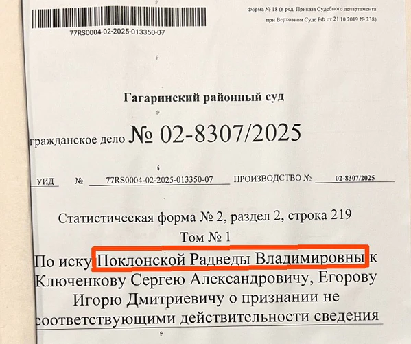 29 октября 2025 года Наталья Поклонская официально сменила имя на Радведу, информация была верифицирована по материалам дела Гагаринского районного суда Москвы, где рассматривался иск о защите чести и достоинства. Журналист Сергей Мардан, будучи ответчиком по этому делу, опубликовал соответствующий документ в своём Telegram-канале[182].