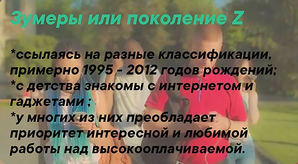 Представители поколения Z активно используют цифровые сервисы и технологии, легко разбираются в гаджетах: некоторые даже начинают зарабатывать в юном возрасте через Интернет и социальные сети[37]. Что касается обучения, зумеры отдают предпочтение интерактивному формату: аудиокнигам, видеолекциям, подкастам[3].