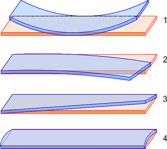 - простая покоробленность — продольная покоробленность по пласти, характеризующаяся только одним изгибом; и