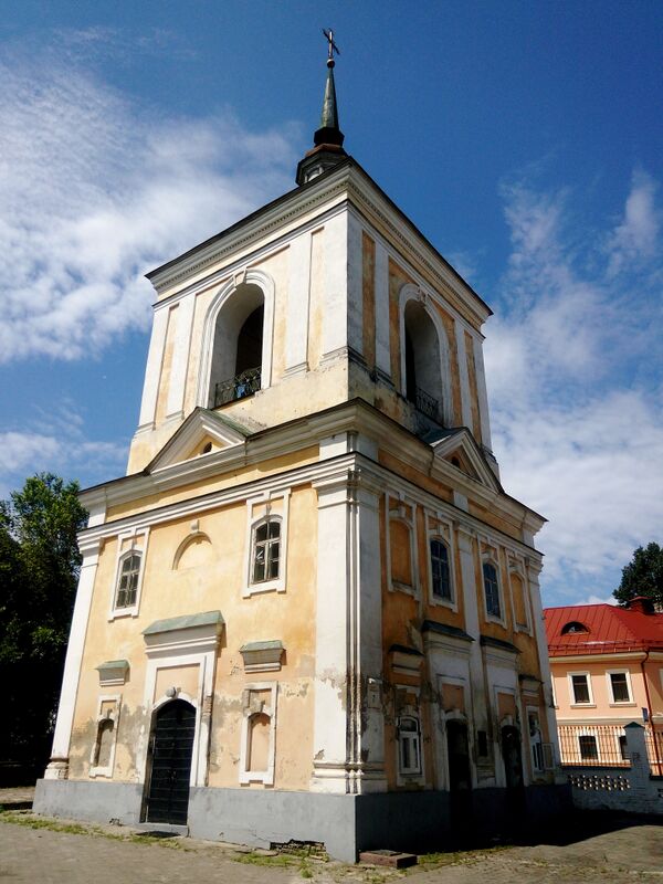Колокольня расположена на северо-запад от церкви. Первоначально второй ярус колокольни был деревянным и уничтожен вместе с завершением во время пожара 1811 года. Строительство второго кирпичного яруса колокольни было закончено до 1831 года. Колокольня кирпичная квадратная в плане двухъярусная. Завершена главой со шпилем. В 1971 году колокольня была отреставрирована.