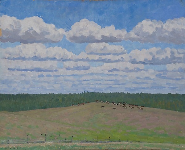 На картине представлен уходящий вглубь холмистый луг с преобладанием охристых и светло-зелёных оттенков в цветовой гамме. На первом плане, параллельно нижнему краю, изображён плетень, на котором сидят тёмные птицы. В центре полотна расположен небольшой холм, склоны которого заняты стадом тёмных коров. Дальше вглубь видна зелёная полоса леса. Верхнюю часть композиции занимает высокое голубое небо с белыми кучевыми облаками, что создаёт ощущение простора и глубины композиции.