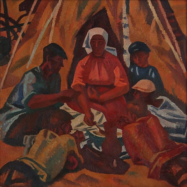 На полотне изображена группа людей, отдыхающих за трапезой во время сенокоса. В центре композиции находится загорелая женщина в красном платье и с белым платком на голове, черпающая пищу из миски. Вокруг неё по кругу размещены мужские фигуры, справа от женщины — мальчик в синей одежде. Сцена передаёт атмосферу сельского труда и отдыха, характерную для бытового жанра, с акцентом на детали одежды и повседневные действия участников.