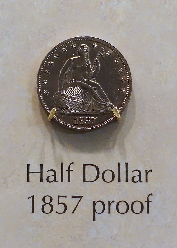 50 центов с сидящей Свободой чеканились на 4 монетных дворах. О происхождении монеты из того или другого монетного двора свидетельствует небольшая буква под изображением орлана: