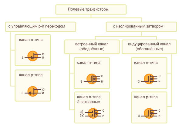 Полевые транзисторы классифицируют на приборы с управляющим p-n-переходом и с изолированным затвором, так называемые МДП («металл-диэлектрик-полупроводник»)-транзисторы, которые также называют МОП («металл-оксид-полупроводник»)-транзисторами, причём последние подразделяют на транзисторы со встроенным каналом и приборы с индуцированным каналом.