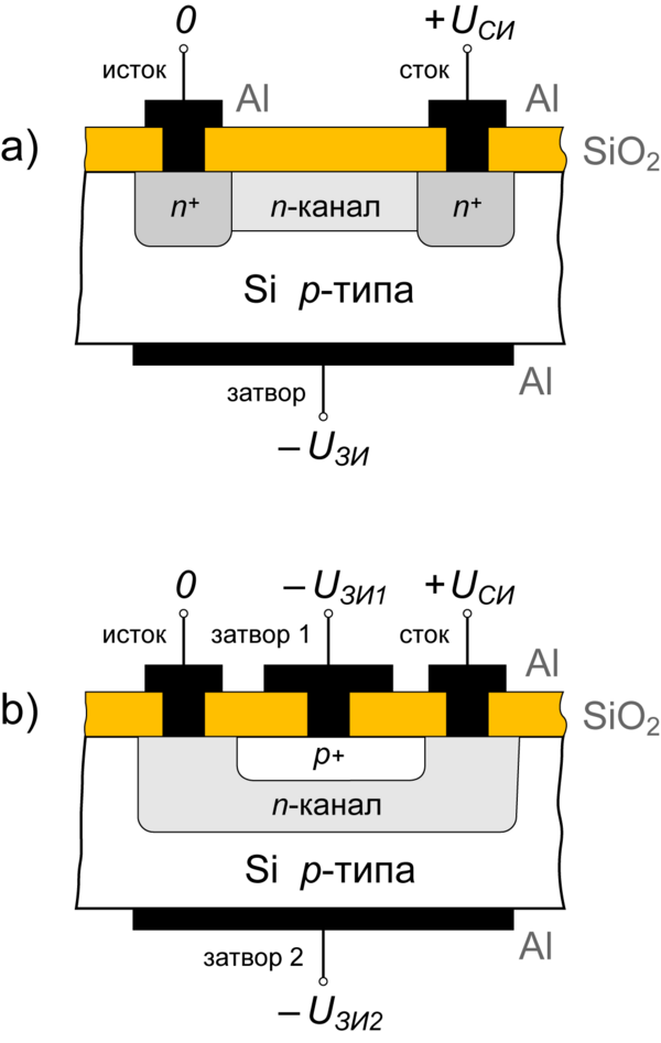 В МДП-транзисторах с индуцированным каналом (рис. 2, а) проводящий канал между сильнолегированными областями истока и стока отсутствует и, следовательно, заметный ток стока появляется только при определённой полярности и при определённом значении напряжения на затворе относительно истока, которое называют пороговым напряжением (UЗИпор).