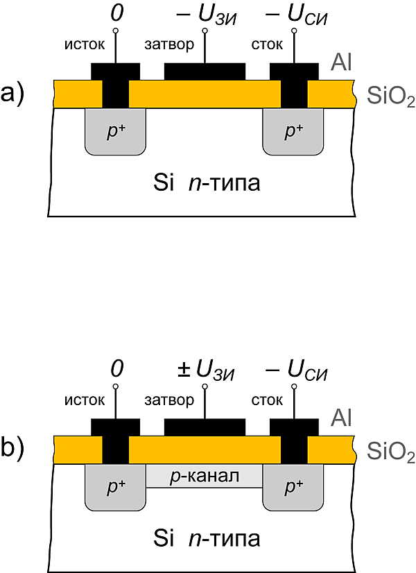 При напряжении на затворе относительно истока, равном нулю, и при подаче напряжения на сток, ток стока оказывается ничтожно малым. Он представляет собой обратный ток p-n-перехода между подложкой и сильнолегированной областью стока. При отрицательном потенциале на затворе (для структуры, показанной на рис. 2, а) в результате проникновения электрического поля через диэлектрический слой в полупроводник при малых напряжениях на затворе (меньших UЗИпор) у поверхности полупроводника под затвором возникает обеднённый основными носителями слой (эффект поля) и область объёмного заряда, состоящая из ионизированных нескомпенсированных примесных атомов. При напряжениях на затворе больших UЗИпор у поверхности полупроводника под затвором возникает инверсный слой, который является каналом p-типа, соединяющим исток со стоком. Поперечное сечение канала будет изменяться с изменением напряжения на затворе, соответственно будет изменяться и ток стока, то есть ток в цепи нагрузки и относительно мощного источника питания.