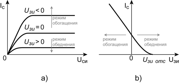 В связи с наличием встроенного канала в таком МДП-транзисторе (рис. 2, b), при подаче напряжения на сток, ток стока оказывается значительным даже при нулевом напряжении на затворе (рис. 3, b). Поперечное сечение и проводимость канала будут изменяться при изменении напряжения на затворе как отрицательной, так и положительной полярности. Таким образом, МДП-транзистор со встроенным каналом может работать в двух режимах: в режиме обогащения и в режиме обеднения канала носителями заряда. Эта особенность МДП-транзисторов со встроенным каналом отражается и на смещении выходных статических характеристик при изменении напряжения на затворе и его полярности (рис. 3).
