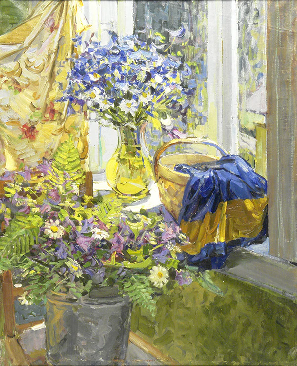 В центре композиции на подоконнике большого окна размещена стеклянная ваза с букетом ромашек и синих колокольчиков. Рядом расположена корзина с синим покрывалом, украшённым жёлтой полосой по краю. На переднем плане, на стуле, находится ещё один букет, составленный из ромашек, колокольчиков и декоративной травы, помещённый в ведро. В левой верхней части картины выделяется декоративное полотно, дополняющее общую атмосферу натюрморта.