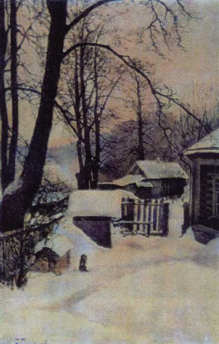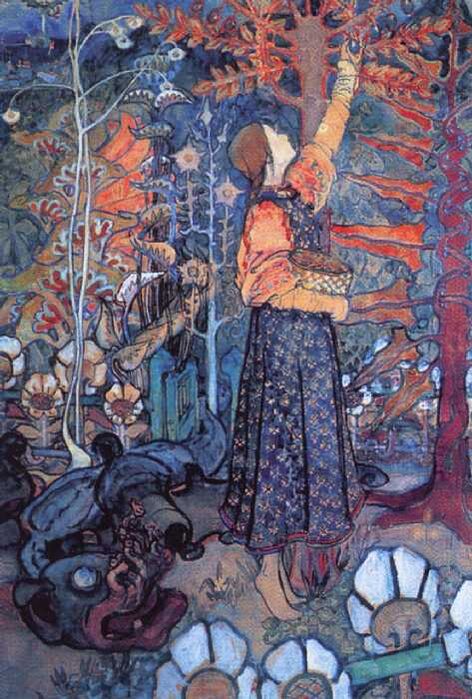 Она быстро прониклась национальными интересами кружка, самым ярким выразителем которого был В. М. Васнецов, воплотивший позже в своих работах национально-романтический стиль эпохи модерн. «Кто дал мне толчок к уразумению древнерусской жизни — так это Васнецов, — писала она Стасову, — у Васнецова я не училась в прямом смысле слова, то есть уроков у него не брала, но как-то набиралась около него понимания русского народного духа»[3]. Внимательнейшее и кропотливое изучение русского народного искусства, страсть к национальному складу не могли не подвести художницу к знакомству с фольклором. Поленова заинтересовалась иллюстрированием сказок и пронесла эту страсть через всю жизнь.