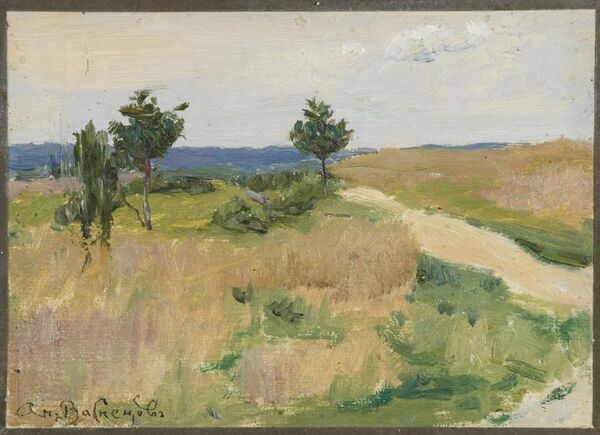 Композиция построена по принципу постепенного углубления пространства: от первого плана с густой зелёной травой взгляд зрителя переходит к дальнему плану, где изображена вспаханная земля. Верхнюю часть картины занимает небо, полностью покрытое светлыми облаками.
