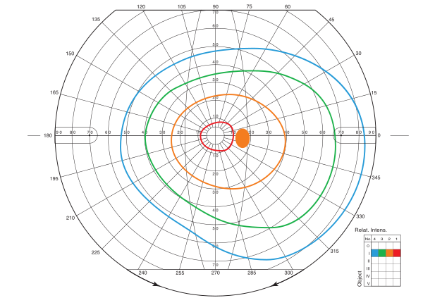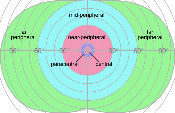 Поле зрения[1] — угловое пространство, видимое глазом при фиксированном взгляде и неподвижной голове. Каждый глаз среднестатистического человека имеет поле зрения: 55° вверх, 60° вниз, 90° наружу (то есть суммарное поле зрения двумя глазами — 180°) и 60° — внутрь. Но это верно только для ахроматического зрения (это связано с тем, что на краях сетчатки нет рецепторов колбочек, способных различать цвет). Наименьший размер поля зрения — у зелёного цвета, наибольший — у синего[2].