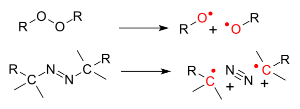 В случае радикальной полимеризации выделяют несколько способов генерирования радикалов в среде мономера. Наиболее часто применяется термическое разложение инициатора: в смесь в количестве < 1 мас. % добавляют азосоединение либо пероксид. Это соединение при нагревании разлагается и образует радикалы, которые служат активными центрами[5].