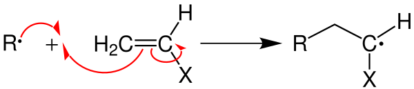 Вторая реакция представляет собой присоединение молекулы мономера к перенесённому радикалу. Если скорость этой реакции практически равна нулю, это означает, что радикал X* устойчив. В этом случае Х называют ингибитором полимеризации. Если константа скорости этой реакции ниже, чем константа скорости роста цепи, то Х является замедлителем[8].
