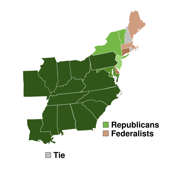 Постепенно влияние и мощь джефферсоновских республиканцев росли, в то время как элитарность их оппонентов отталкивала от них избирателей. Сокрушительный удар по федералистам был нанесён в середине 1810-х годов, когда они отказались поддержать Англо-американскую войну 1812—1815 годов, что поставило партию на грань раскола. Разгромное поражение оппозиции на выборах 1816 года и наступившая после него Эпоха добрых чувств (англ. Era of Good Feelings, 1816—1824) положили конец Первой партийной системе. Восемь лет, в течение которых одна партия практически безраздельно царила на политической сцене, привели к тому, что партийная дисциплина потеряла свою актуальность и республиканцы распались на несколько фракций[7].