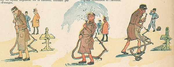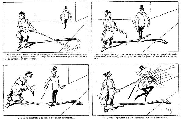 «История без слов. — Общественный поливальщик», появившаяся в 1889 году, была создана Кристофом, одним из самых известных и почитаемых авторов комиксов во Франции конца XIX века, и опубликована 3 августа 1889 года. Хотя этот комикс появился за пять лет до фильма братьев Люмьер, он был хорошо известен в своё время и упоминался как вероятное влияние, если не как прямой источник, Д. Крафтоном, Садулем и другими историками комиксов и кино[11]. Версия Кристофа является самой поздней из трёх примеров, но также и самой простой по форме, стилю и подаче, используя сетку непрерывности из шести регулярных панелей одинакового размера, в которой уличный поливальщик является наиболее заметным элементом. Направление точки обзора остаётся постоянным и подвижным лишь в той мере, в какой оно следует за поливальщиком к гидранту и обратно на улицу. Однако в рамках чёткого разграничения этого пространства композиция и расположение фигур используют глубину изображения. Перспектива подчёркивает контраст между крупным, заметным поливальщиком и маленьким, далёким мальчиком, хотя персонажи остаются визуально и символически связанными извивающимся шлангом[11].