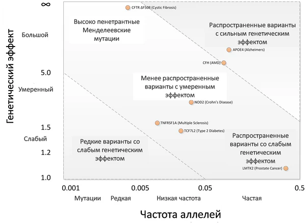 Геномы двух любых людей имеют огромное число различий. Это могут быть как однонуклеотидные полиморфизмы, так и более крупные изменения: делеции, вставки и изменения копийности генов. Любое из этих различий может отвечать за отдельные характерные особенности индивидуума (например, цвет глаз, цвет волос)[11] или стать причиной заболевания[12]. До появления методов для полногеномного поиска ассоциаций исследования основывались на анализе сцепленного наследования в семьях. Этот подход оказался весьма эффективным для выявления генов, ответственных за заболевания с простым менделевским наследованием, таких как муковисцидоз. Тем не менее, подобные генетические исследования оказались малоэффективными для выявления причин более сложных заболеваний[13]. В качестве альтернативы для этого метода был предложен полногеномный поиск ассоциаций. Этот тип исследований основан на анализе частоты аллелей различных генов среди индивидуумов. Если при сравнении те или иные аллели генов встречаются у людей с исследуемым фенотипом (например, у носителей болезни) значимо чаще, чем у других, то есть основания предполагать, что именно эти аллели ответственны за проявление этого фенотипа. Отсчёты мощности статистических тестов, применяемых для полногеномного поиска ассоциаций, показывали, что этот способ лучше, чем другие, такие как исследование сцепления, подходит для обнаружения слабых генетических эффектов[14].