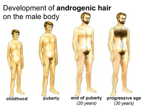 Первыми появляются лобковые волосы, вскоре после начала роста половых органов. Появившись в небольшом количестве у основания полового члена, волосы постепенно становятся гуще и занимают весь лобковый треугольник, после чего распространяются на бёдра и по белой линии живота к пупку. Следом, по истечении нескольких месяцев и даже лет, начинается рост волос в подмышечных областях, около заднего прохода, над верхней губой, около ушей, вокруг сосков и на подбородке. Последовательность и скорость роста волос подвержены индивидуальным различиям. В течение жизни волосы продолжают расти и становятся гуще на руках, ногах, груди, животе и спине. Не у всех мужчин имеется полный рост волос на лице, и не все имеют волосы на груди.