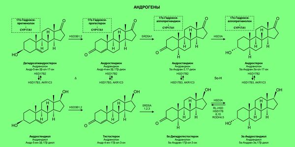 - Андрогены (андростендиол, тестостерон, дигидротестостерон и др.).