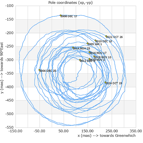 В случае рассмотрения Земли полодия представляет собой кривую, напоминающую спираль, витки которой сжимаются и разжимаются. Период скручивания и раскручивания спирали полодии составляет приблизительно 6 лет[1]. Регулярные и систематизированные измерения проводятся с 1846 г.
