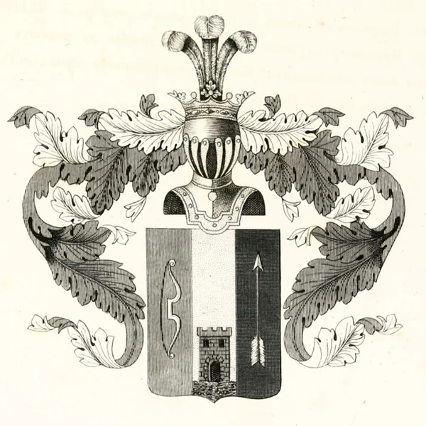 На щите дворянский коронованный шлем. Нашлемник: три страусовых пера. Намёт на щите красный, подложенный серебром[3]