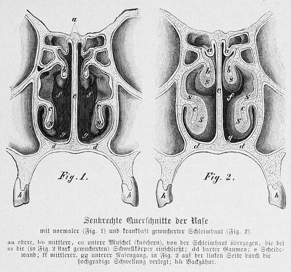В носовой полости воздух очищается от частиц пыли и микроорганизмов, согревается и увлажняется. Носовая полость в норме выполняет дыхательную, обонятельную, защитную и резонаторную функции. Через нос проходит весь вдыхаемый и выдыхаемый воздух. Воздушная струя вследствие извилистости носовых ходов образует завихрения и совершает дугообразный путь. Поэтому-то через нос воздух проходит медленнее, чем через рот. В результате давления струи воздуха на слизистую оболочку полости носа происходит возбуждение дыхательного рефлекса, и грудная клетка расширяется больше, чем при вдохе через рот. Защитную функцию полости носа осуществляют очищением, согреванием, увлажнением и стерилизацией вдыхаемого воздуха. Движение воздуха в носовой полости обеспечивает также обонятельное восприятие. Кроме того, носовая полость наряду с околоносовыми пазухами, глоткой и полостью рта служит резонатором для голоса. Нарушение носового дыхания отражается на состоянии всего организма.
