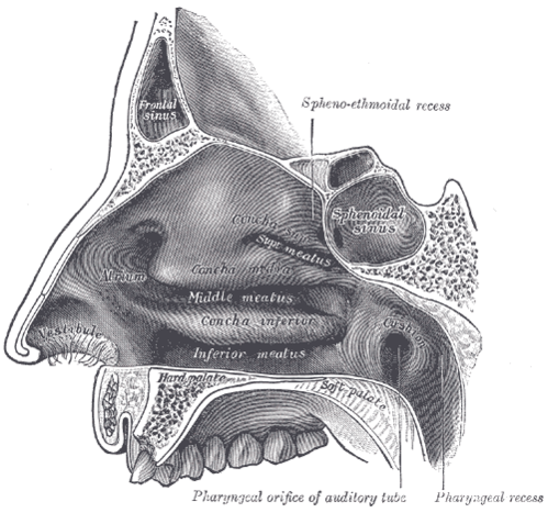 Придаточными пазухами носа являются — лобная, верхнечелюстная (Гайморова) и клиновидная, а также ячейки лабиринта решётчатой кости.