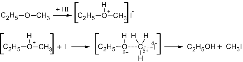Обычно реакцию проводят нагреванием эфира и концентрированного раствора бромоводородной или йодоводородной кислоты, при этом расщепление может осуществляться как по механизму SN1, так и SN2[24]: