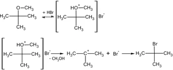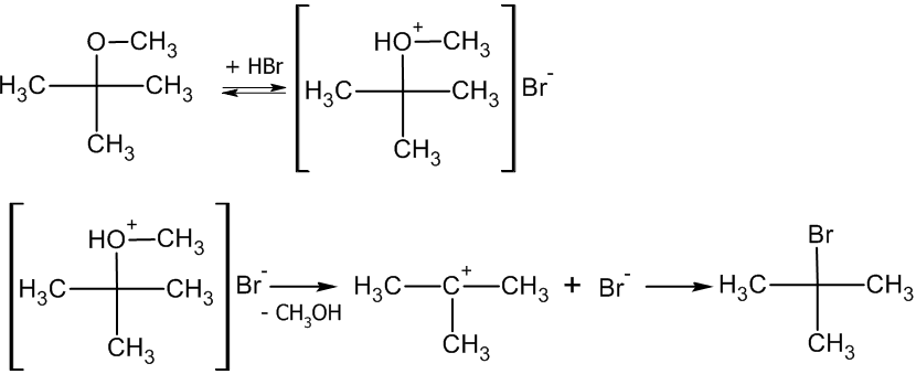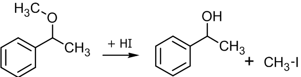 Если в реакцию вступают несимметричные эфиры, в результате получаются два спирта и два галогенпроизводных, однако если эфир метиловый, продуктом реакции будет спирт и метилиодид или метилбромид[25]: