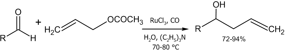 - Реакция аллилацетата с альдегидами в присутствии солей рутения (Denmark S. E., Nguyen S. T., 2009 год)[46]: