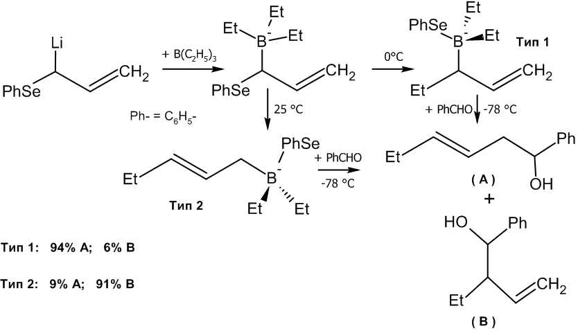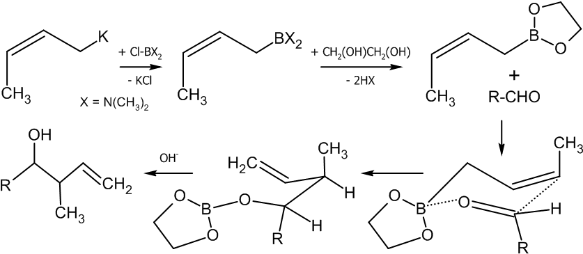 Современным методом получения аллильных спиртов заданной конфигурации является применение в качестве агента аллилборана, который реагирует с альдегидами в присутствии оснований по следующей схеме[36]: