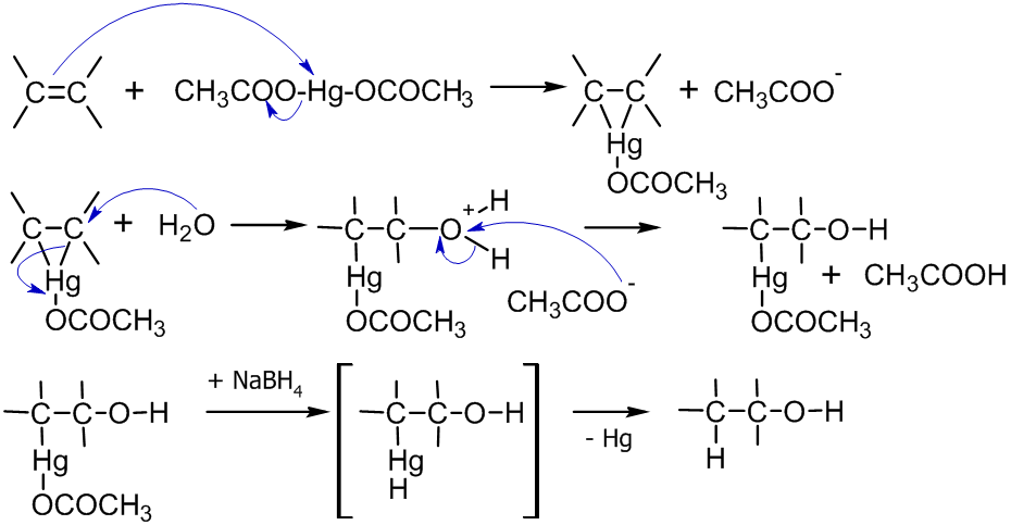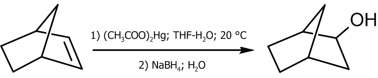 Синтез спиртов гидроксимеркурированием-демеркурированием алкенов протекает в мягких условиях, с выходами близкими к количественным (90-98 %) и практически без образования побочных продуктов; при этом промежуточное ртутьорганическое соединение не требует выделения — все стадии реакции протекают в один за другим[12].