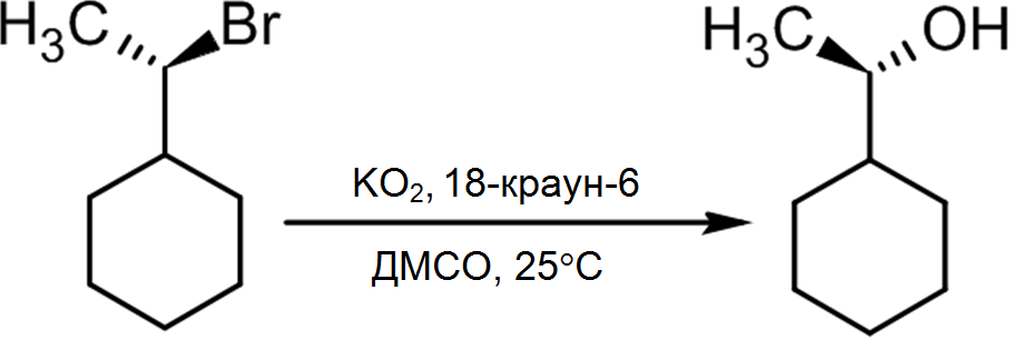 В то же время существует достаточно новый метод превращения в спирты алкилгалогенидов действием на последние супероксида калия в среде диметилсульфоксида в присутствии 18-краун-6, при этом происходит практически полное геометрическое обращение[2]: