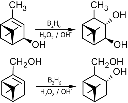 Высокая селективность указанных выше производных борана позволяет избирательно вступать в реакцию с цис-изомером, находящемся в смеси транс-изомером или гидроборировать одну двойную связь из двух имеющихся в молекуле алкена, например[6]:
