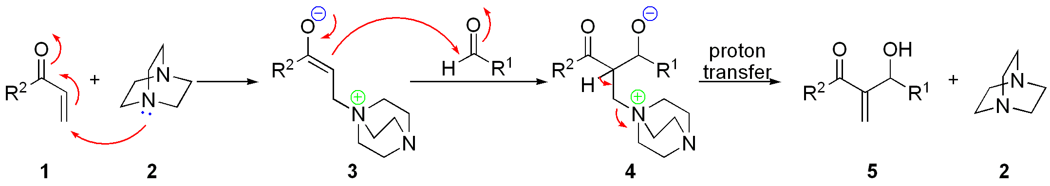 Традиционная реакция Бэйлиса-Хиллмана-Морита представляет собой метод получения аллиловых кетоспиртов взаимодействием альдегидов с метилвинилкетонами или другими активированными алкенами в присутствии третичных фосфинов и каталитических количеств фенола или его производных[41]. Впоследствии реакция была несколько модифицирована: в качестве катализатора стали использовать третичные амины (например: 1,4-диазобицикло[2.2.2]октан или DABCO[42]):