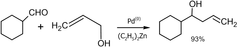 Аналогом синтетического метода, рассмотренного в предыдущем подразделе, является реакция сочетания альдегидов с аллиловыми спиртами и их производными в присутствии катализаторов. В научной литературе описано множество лабораторных методик осуществления подробного синтеза с примененением органических соединений кремния, олова, хрома, лития, рутения, палладия, цинка, титана, циркония и других металлов.