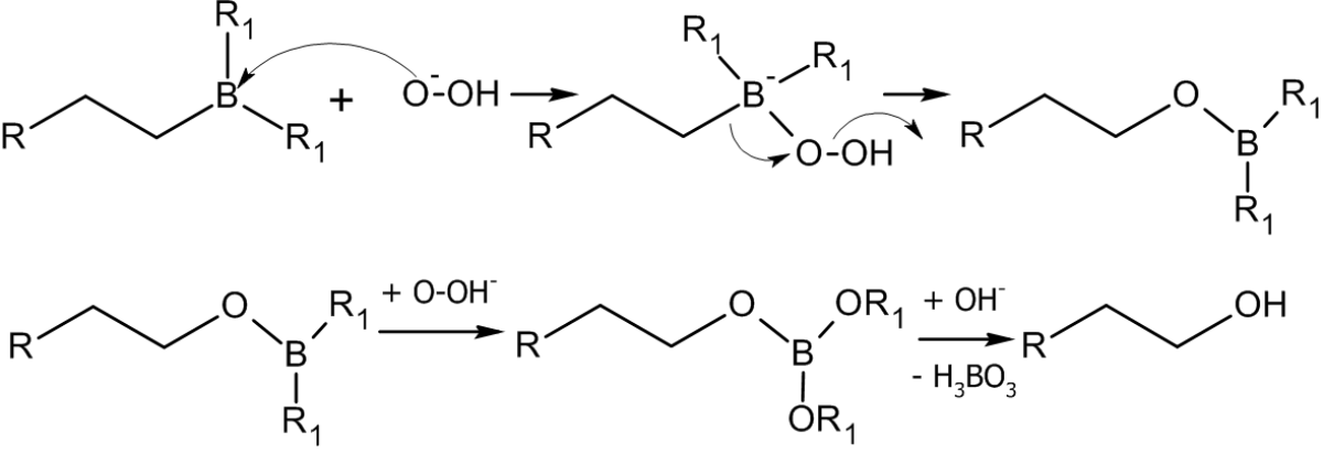 Алкилбораны легко расщепляются под действием пероксида водорода в щелочной среде, образуя спирты[14]: