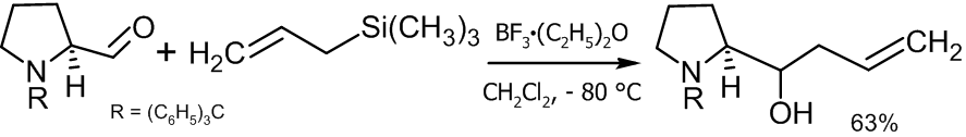 Другим удобным агентом, реагирующим по данной схеме является аллилборный эфир винной кислоты (Рауш, 1985 год)[38].