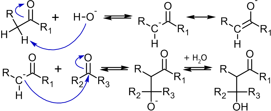 Альдольная конденсация — это одна из старейших реакций органического синтеза (1872 год, Вюрц), в которой две молекулы альдегида или кетона под действием основания или кислоты соединяясь, образуют кетоспирты или альдоли[54]: