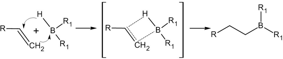 Присоединение происходит многоступенчато с образованием промежуточного циклического активированного комплекса, причем присоединение бора происходит против правила Марковникова — к наиболее гидрогенизированному атому углерода[14]: