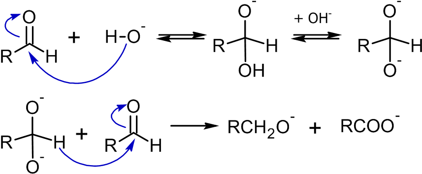 Реакция Канниццаро представляет собой оксилительно-восстановительное диспропорционирование альдегидов в первичные спирты и карбоновые кислоты под действием оснований[49]: