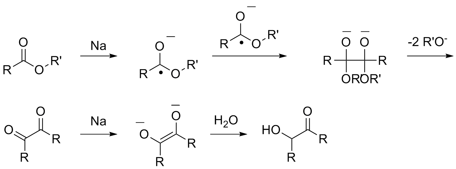 Ацилоиновая конденсация представляет собой получение α-гидроксикетонов (ацилоинов) восстановлением сложных эфиров металлическим натрием: